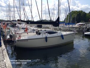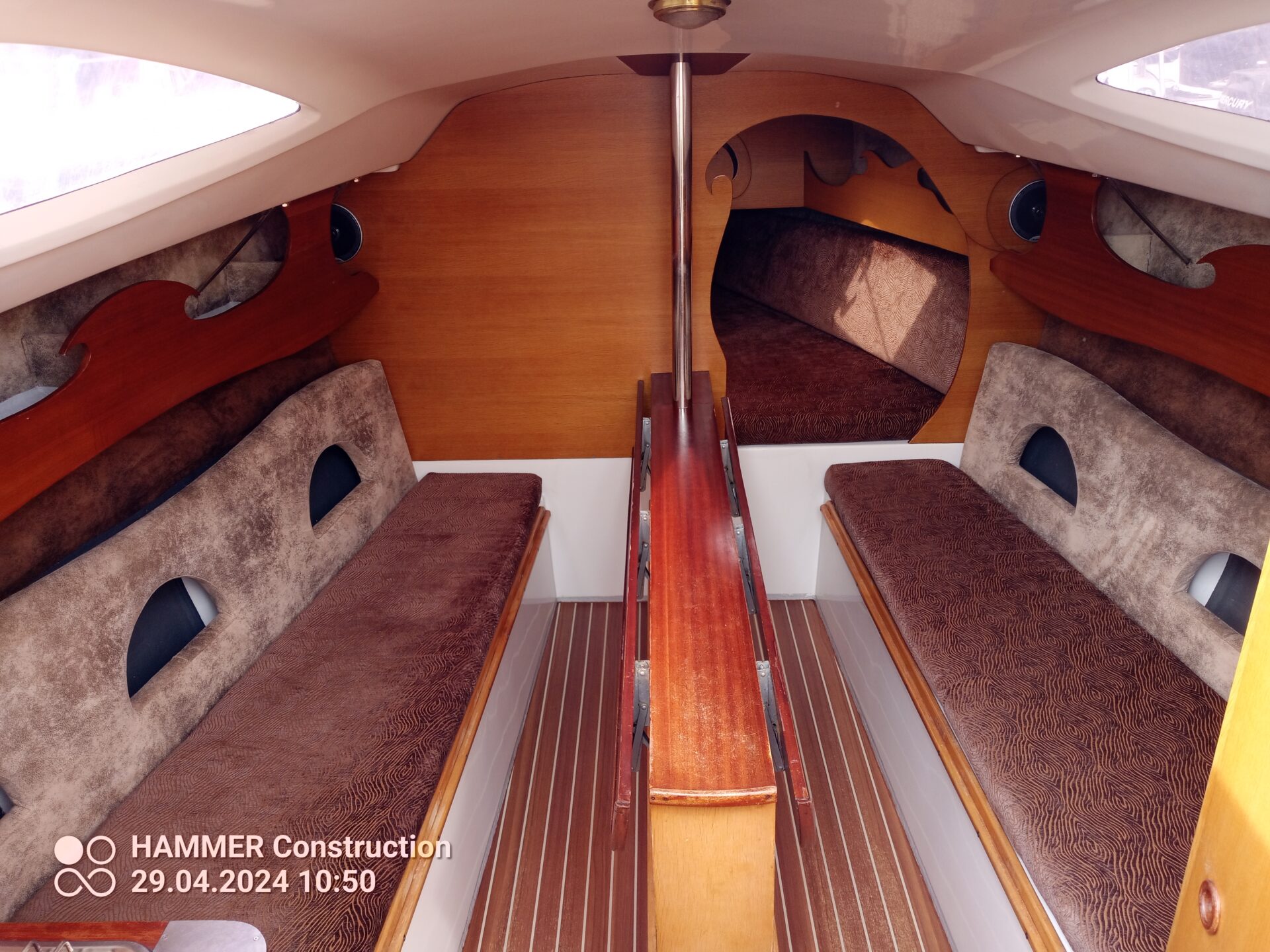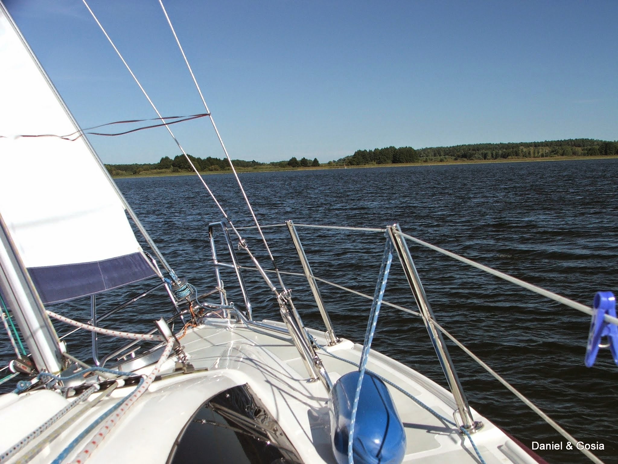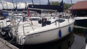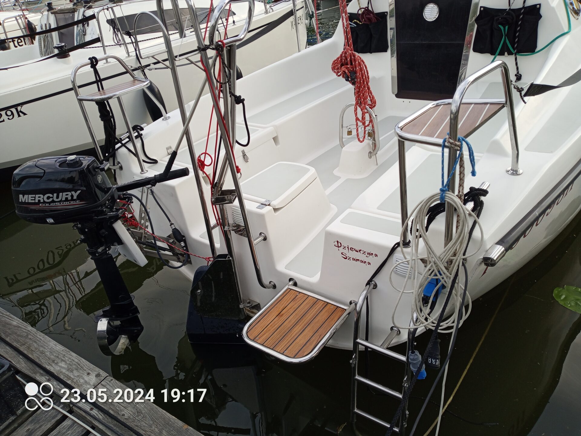 grot na pełzaczach, rolfok na sztywnym sztagu, lazy jack, tent, relingi, kosz dziobowy, środki ratunkowe
