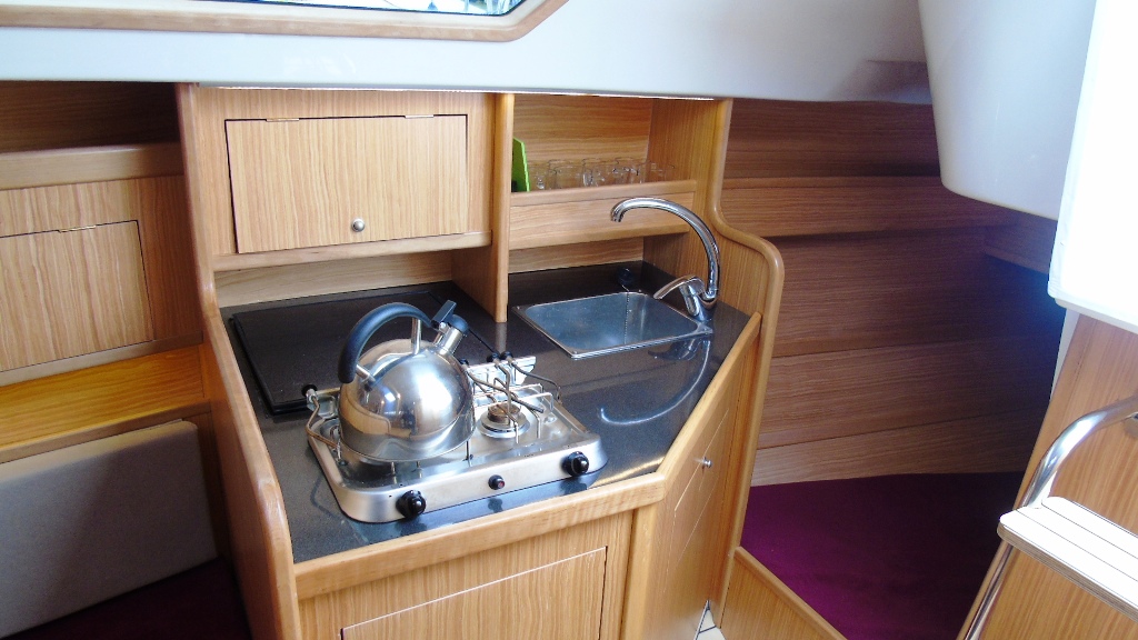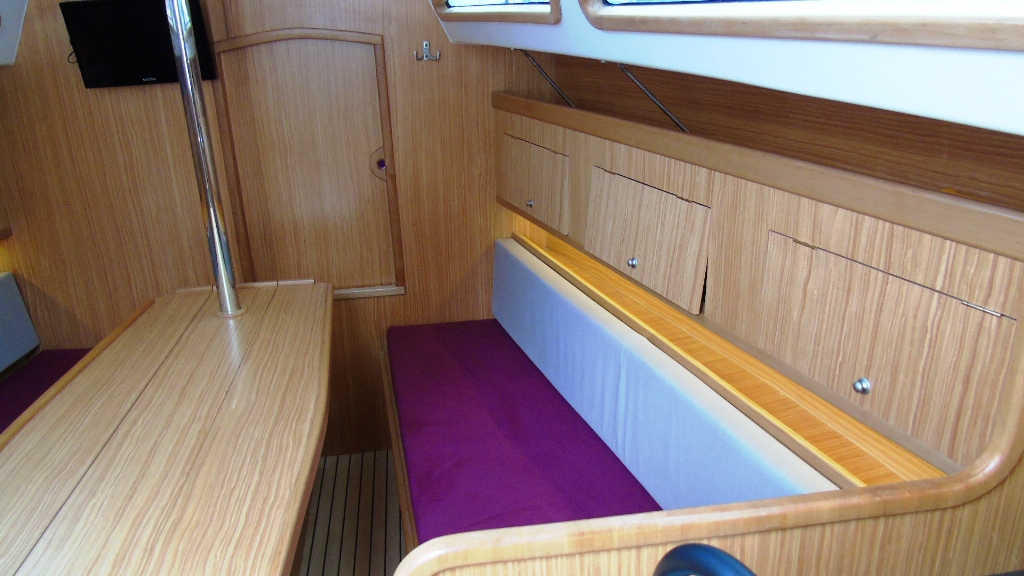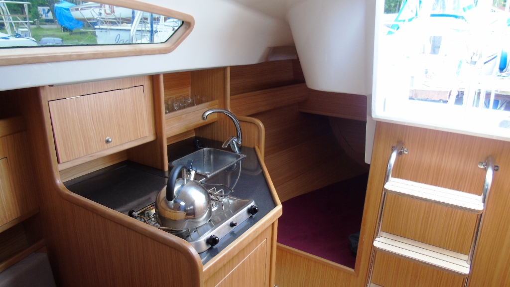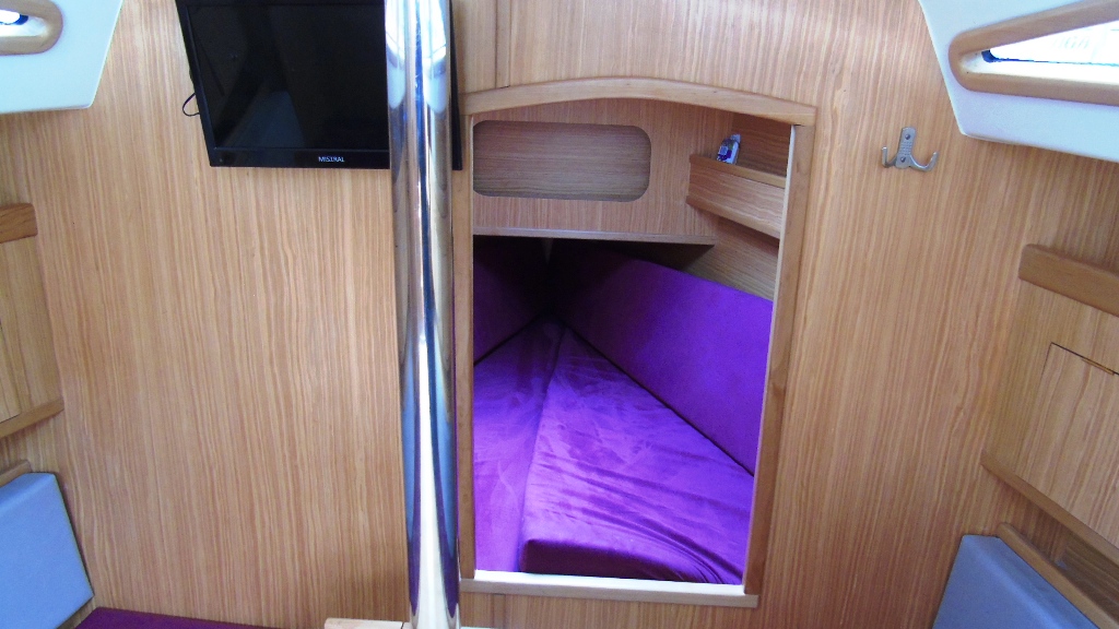 Jacht zarejestrowany na 8 osób. Układ koi: 2 osoby na rufie, 2 osoby w zamykanej kajucie dziobowej, 4 osoby w mesie .