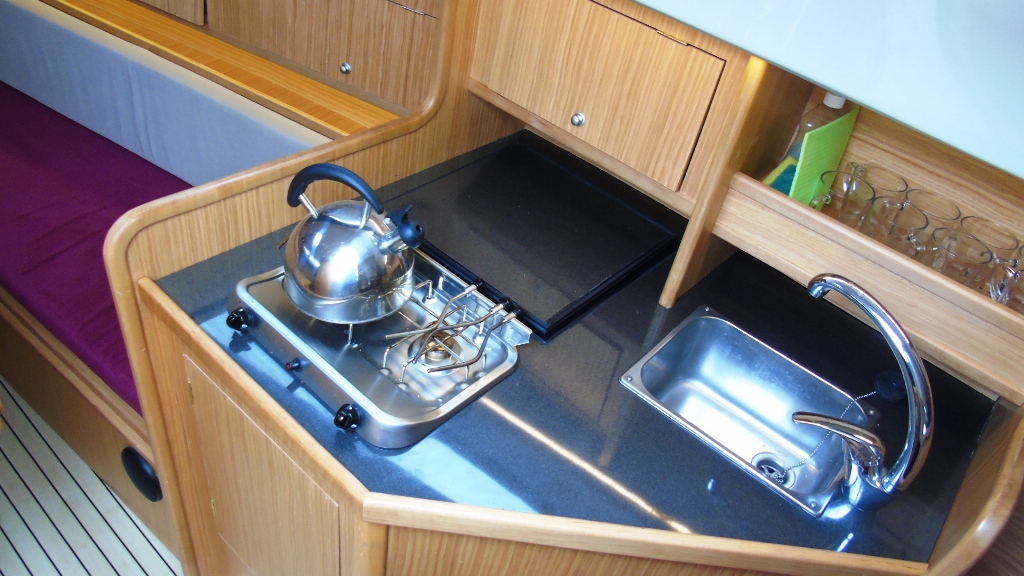 Kambuz i mesa: ogrzewanie diesla Ebersprechen, kuchenka gazowa, lodówka, instalacja wody pitnej zbiornik 50 l, zastawa stołowa, wyposażenie do gotowania, czajnik, sztućce, wc chemiczne