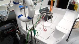 Kokpit: W bakiście znajdziesz wiadro, szczotkę z szufelką, szmatę pokładową, miskę, siekierę, saperkę. Jacht wyposażony jest w p gniazdo prądowe zasilające.