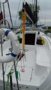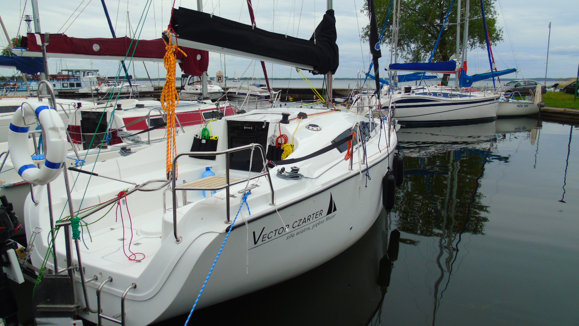 Podstawowe wyposażenie żeglarskie: Ożaglowanie,- fok klasyczny, grot na pełzaczach, rolfok na sztywnym sztagu, lazy jack, tent rumpel, płetwa na pawęży , środki ratunkowe w ilości 8 kamizelek i koło.